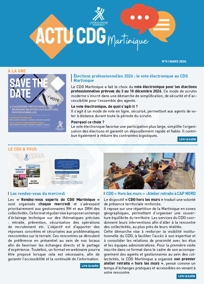 Centre de Gestion de la Fonction Publique Territoriale de Martinique Actualités Actualités Newsletter "ACTU CDG Martinique" – N°5 Mars 2026 Concours et Examens Liste d'aptitude du concours externe, interne et 3ème voie de Rédacteur Territorial - session 2025 Actualités Élections professionnelles 2026 : Le vote électronique au CDG Martinique Toute l'actualité