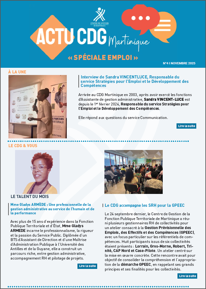Newsletter « ACTU CDG Martinique » (Spéciale Emploi) – N°4 Novembre 2025 Accueil Actualités Newsletter « ACTU CDG Martinique » (Spéciale Emploi) – N°4 Novembre 2025 Actualités "ACTU CDG Martinique" (Spéciale Emploi) – N°4 Novembre 2025 Retrouvez la dernière lettre d’information du CDG Martinique. Newsletter : « ACTU CDG Martinique » – Novembre 2025 Document PDF - 1,9 Mo Visualiser À voir également Consultez les précédentes newsletters du CDG Martinique.