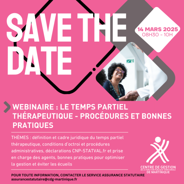 Webinaire : Le Temps Partiel Thérapeutique (Procédures et bonnes pratiques) Accueil Actualités Webinaire : Le Temps Partiel Thérapeutique (Procédures et bonnes pratiques) Actualités Webinaire : Le TPT - 14/03/2025 - CDG MARTINIQUE